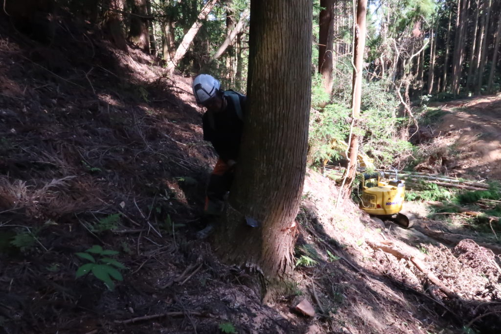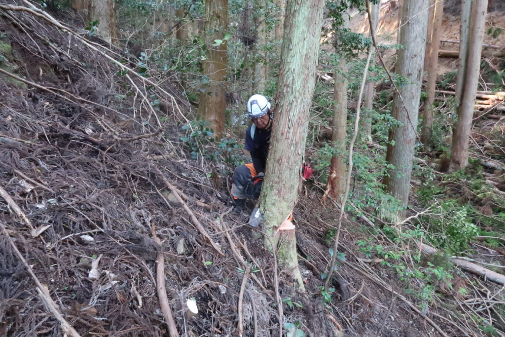 建築材等に用いる目的で、戦後育林してきた樹木(スギ・ヒノキ等)を伐採し、搬出する作業。